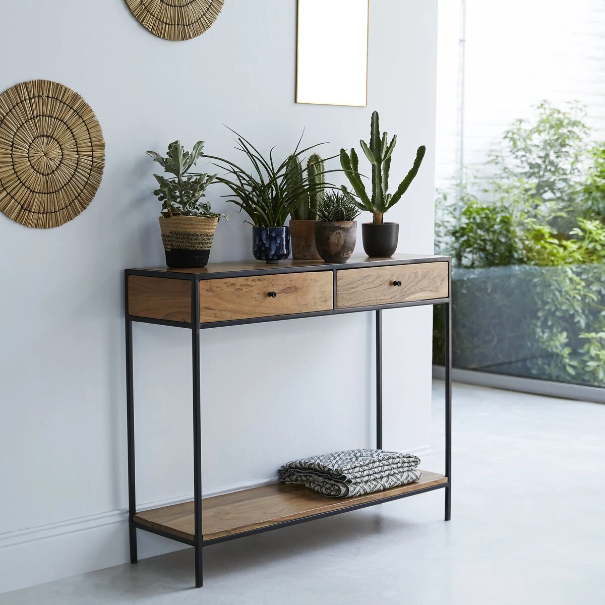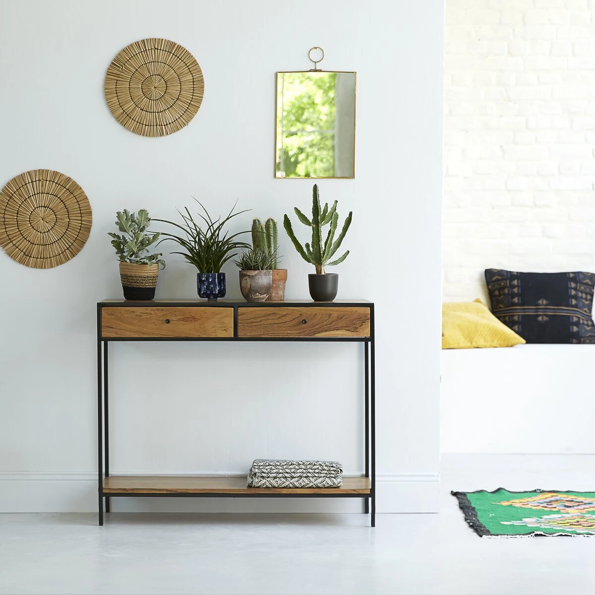 Directement inspirĂ© des anciennes usines, ce petit meuble affiche sa belle sobriĂ©tĂ© au sĂ©jour, dans une entrĂ©e ou au salon… On place dans les tiroirs tous ces petits objets qu’on ne veut pas voir traĂ®ner mais qui nous sont pourtant indispensables au quotidien : les clĂ©s, le courrier, les stylos, le papier brouillon… Pour un effet dĂ©co encore plus rĂ©ussi, vous pouvez, comme sur notre photo, y placer diffĂ©rentes variĂ©tĂ©s de plantes ou des objets dĂ©co, des cadres photos… Vous pouvez aussi lui dĂ©dier un rĂ´le plus pratique et la transformer en petit bureau Ă©critoire. Quel que soit l’usage que vous en ferez, la console en mĂ©tal et acacia Agra confĂ©rera Ă votre intĂ©rieur un petit air vintage très apprĂ©ciĂ© dans la dĂ©co d’aujourd’hui.