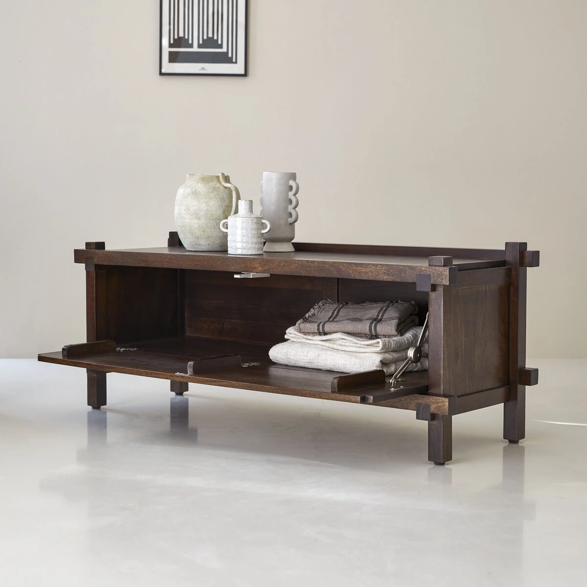 Le meuble TV Arko en manguier massif existe dans une version avec tiroirs.