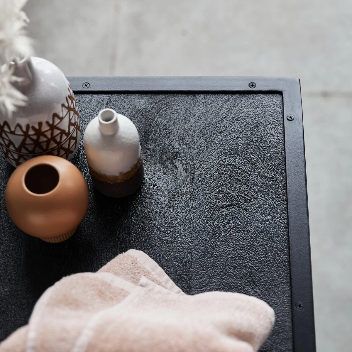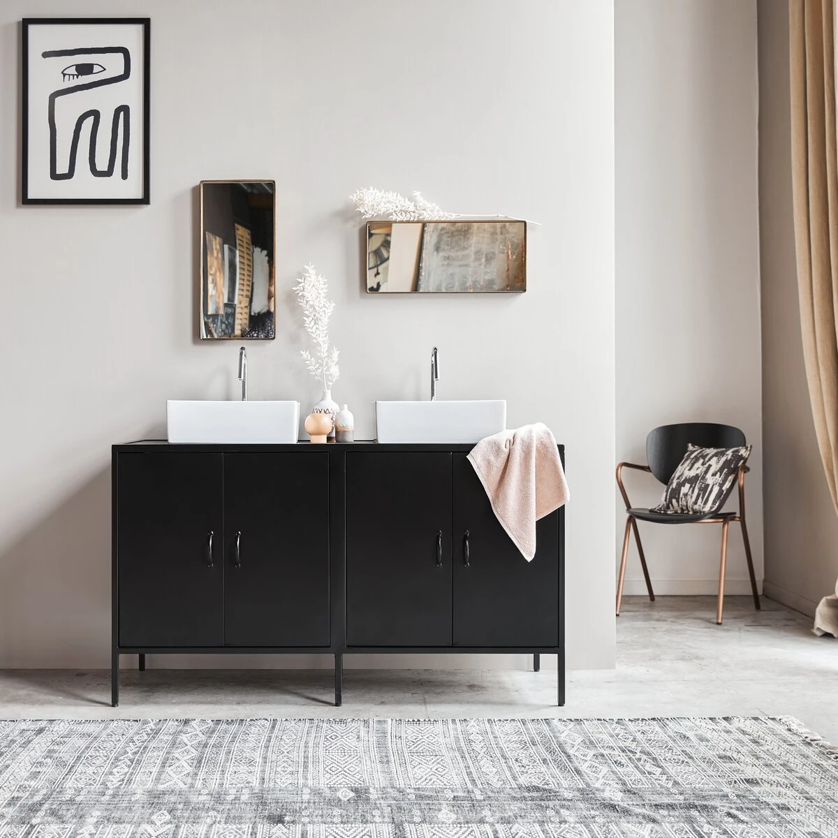 Le meuble de salle de bain en métal et manguier Arsène conjugue accord parfait des matières et bel esprit industriel. Le plateau du dessus réalisé dans un manguier massif peint et laqué confère à l’ensemble un caractère affirmé. On aime son côté vintage qui investit désormais toutes les pièces de la maison, la belle capacité de rangement et sa belle sobriété. Au gré des envies, on associe au meuble de salle de bain en métal et manguier Arsène, une vasque à poser en céramique (sur la photo, Lada), une vasque en marbre ou une vasque en terrazzo.