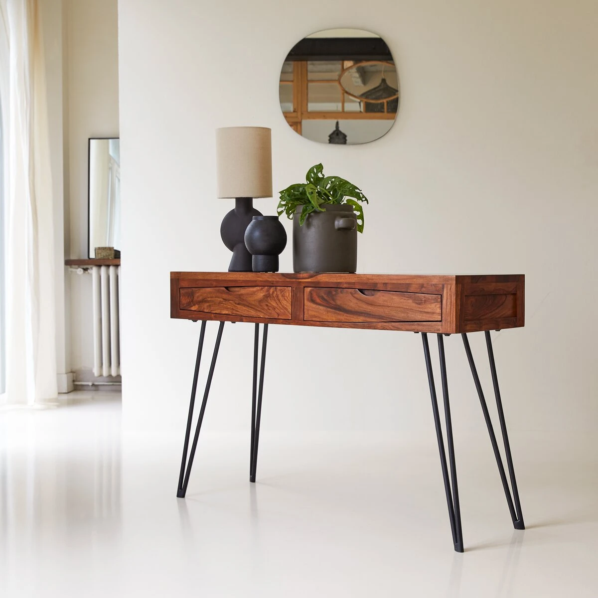 Découvrez notre élégante console Bonnie en sheesham provenant d’Inde, elle est équipée de 2 tiroirs prêts à acceuillir tout votre nécessaire. Vous serez séduits pas son style authentique caractérisé par sa teinte chamarrée qui procurera une note chic et chaleureuse à votre intérieur. Les lignes sobres et douces de cette console en font un meuble élégant et adaptés à toutes les décorations.