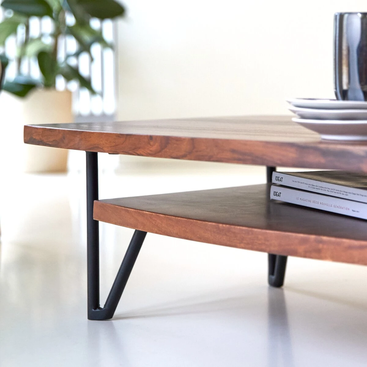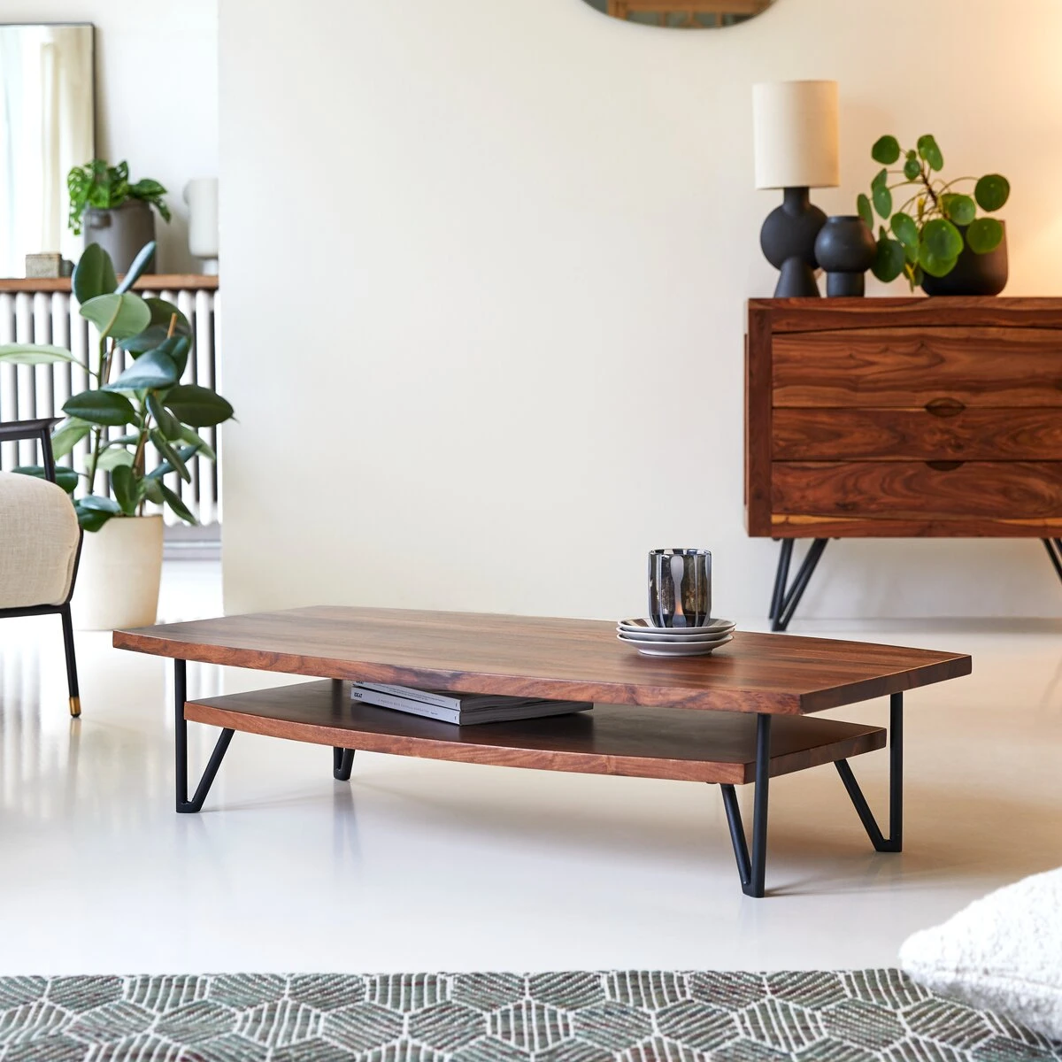 Non seulement la table basse en sheesham Bonnie double plateau affiche des lignes contemporaines tout à fait dans la tendance déco actuelle, mais elle offre en plus la chaleur d’un bois massif aux superbes nuances et l’esprit graphique de pieds en métal.
