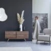 Le banc TV suspendu en teck Circa offre une généreuse capacité de rangement assurée par un tiroir et deux niches. Bien large, il permet d’accueillir le matériel multimédia et de jolis éléments de déco.