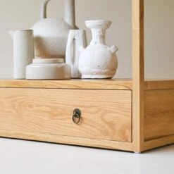 D’inspiration exotique, la console avec tiroir en chêne massif Clovis est idéale pour habiller une cloison dans le salon ou le séjour… Elle reçoit avec élégance des objets déco (par exemple, une série de vases comme sur notre photo) et peut aussi accueillir des bouquets de fleurs, des magazines ou servir de desserte. Dans ses niches, on y glisse les magazines ou notices à garder toujours à portée de main et dans le large tiroir, tout ce qu’on ne veut pas voir traîner dans la pièce.