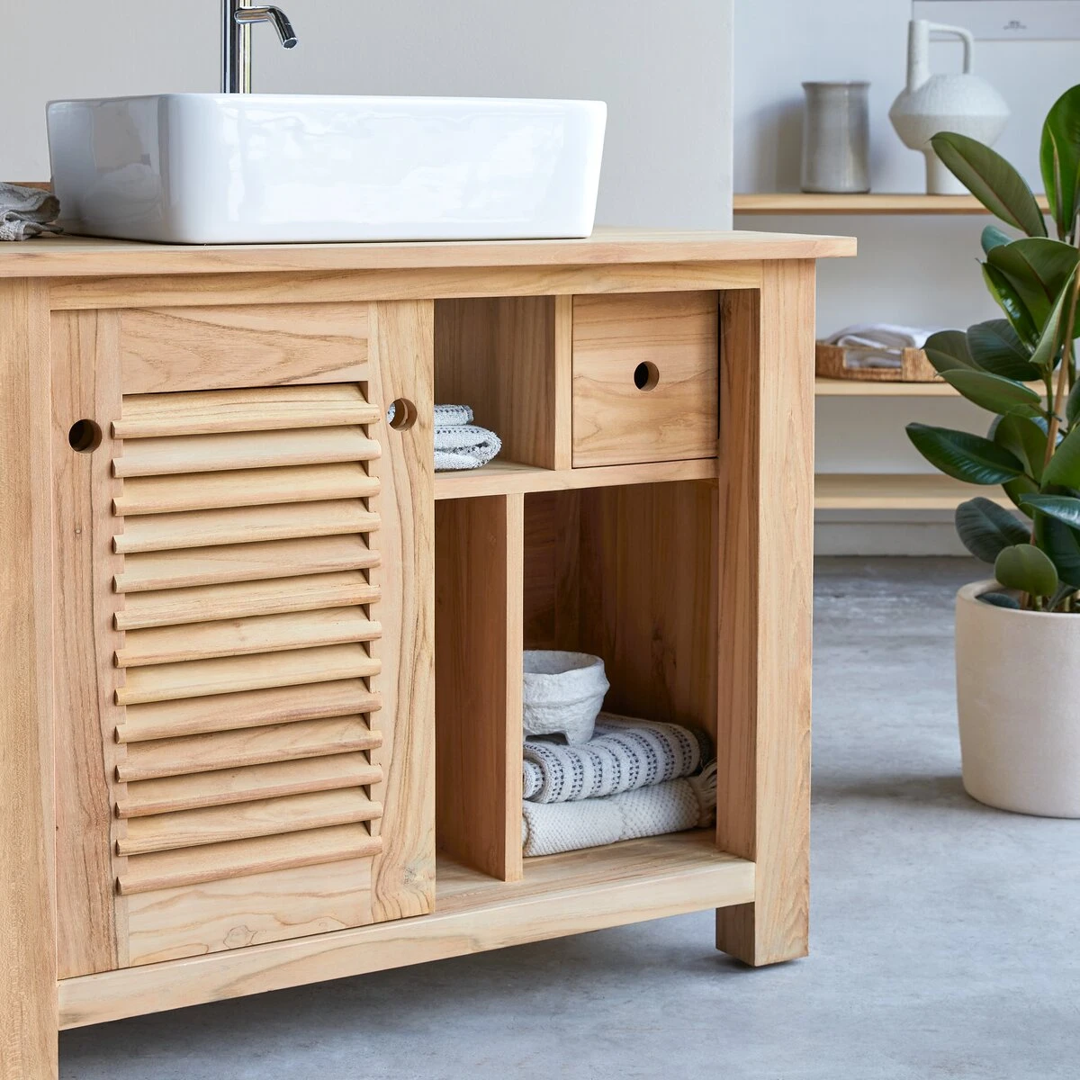 Le meuble de salle en teck massif Coline peut être complété par la colonne en teck massif Coline en un ensemble total look du plus bel effet. Il peut aussi être combiné à vos propres meubles et existe aussi en version double vasque.