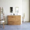 Le meuble de salle de bain Edgar en teck massif et terrazzo premium moon existe aussi en 80 cm. Il vous est Ă©galement proposĂ© avec un plan vasque en cĂ©ramique, en pierre de lave, en terrazzo pink et dans une version noyer.Â