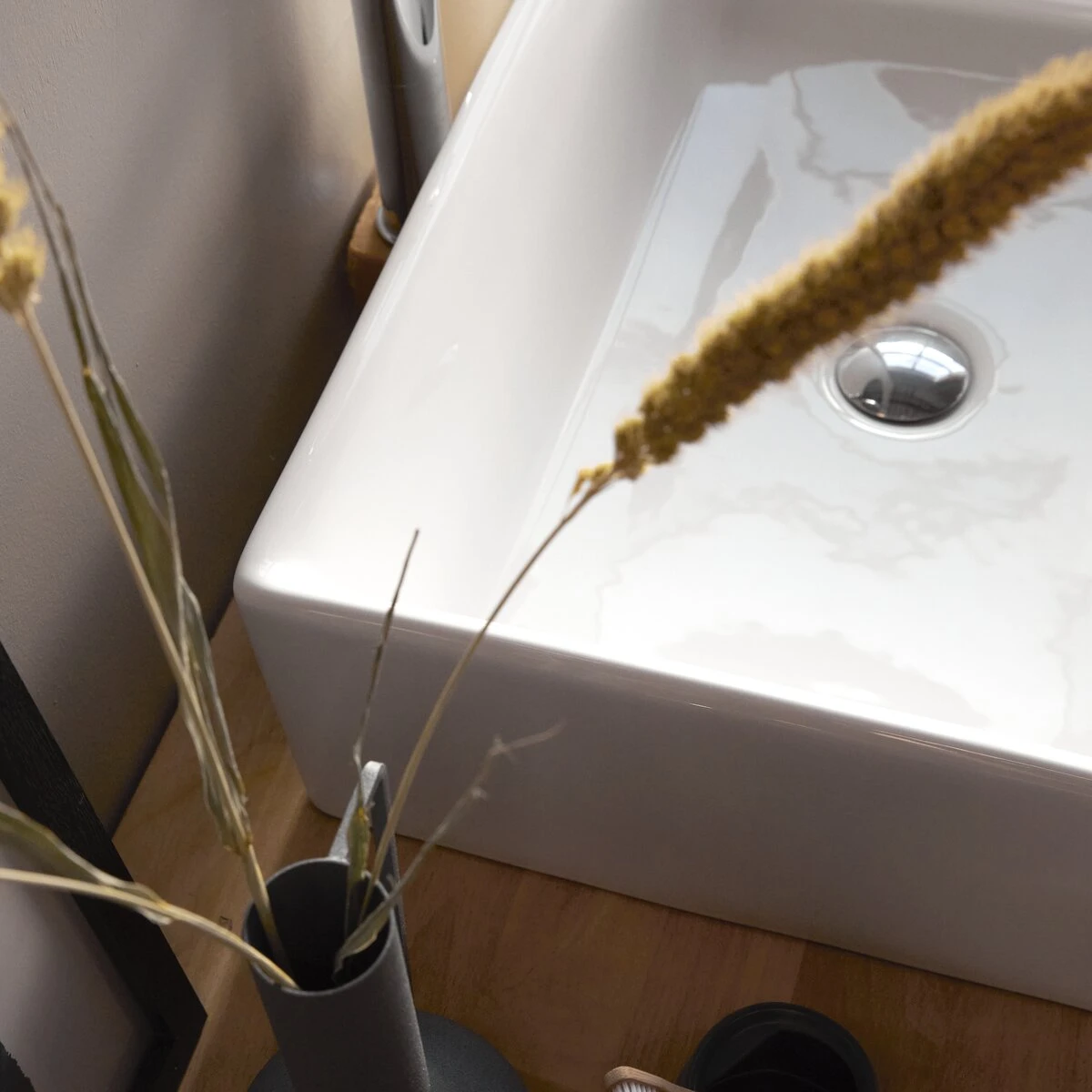 La vasque en céramique existe aussi en version ronde et en version carrée.