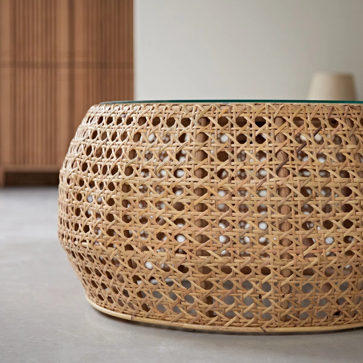 DĂ©couvrez notre table basse cannĂ©e en rotin naturel vernis. IdĂ©ale dans votre salon, elle trouvera Ă©galement sa place dans votre vĂ©randa ou dans un jardin d’hiver.