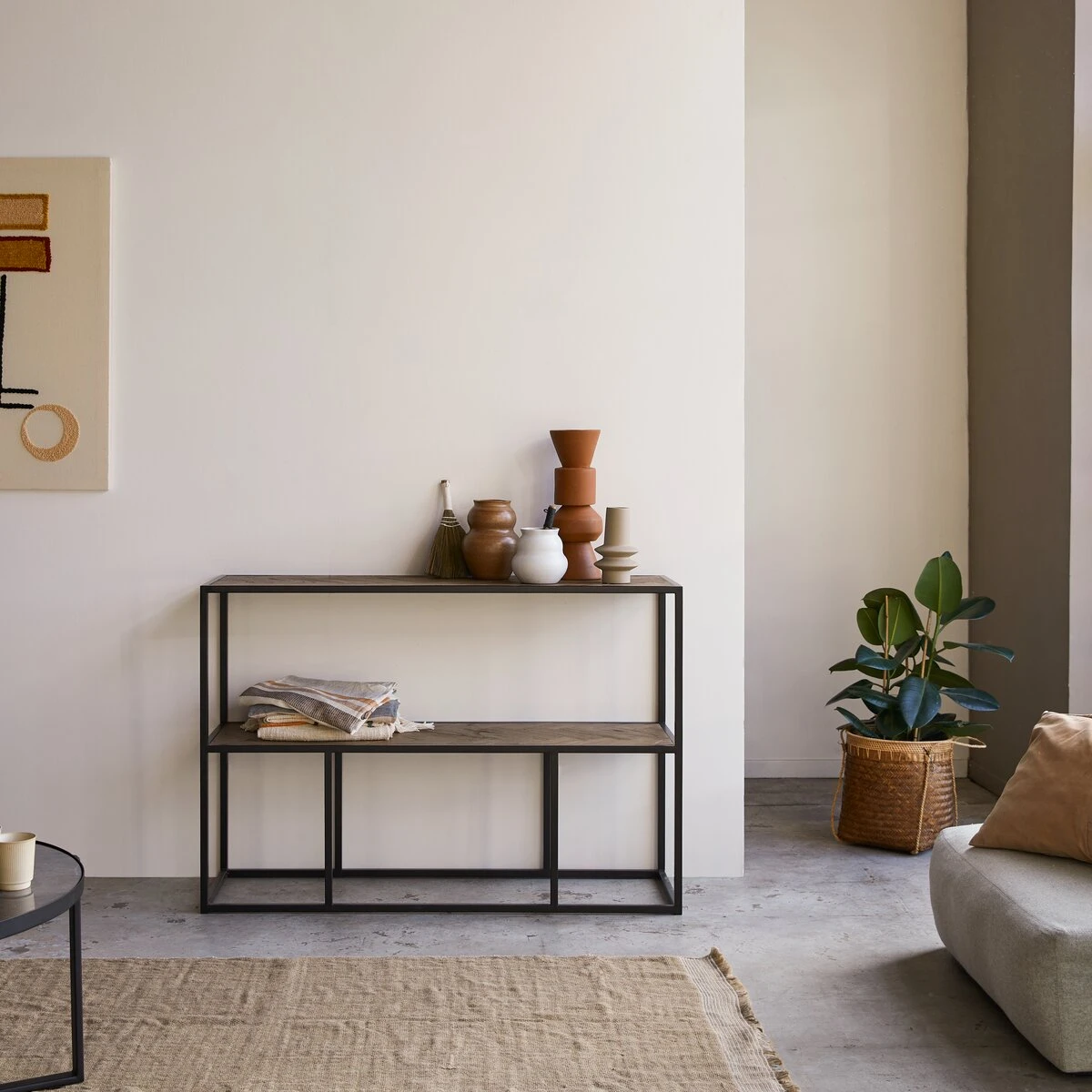 La console en métal et orme Isak s’installe avec talent sur un mur libre du séjour ou du salon pour mettre en beauté objets de déco, ranger des livres ou exposer ce qu’on aime avoir toujours dans le champ de vision. Elle peut aussi devenir séparation d’espace ou redessiner les proportions d’un long couloir.