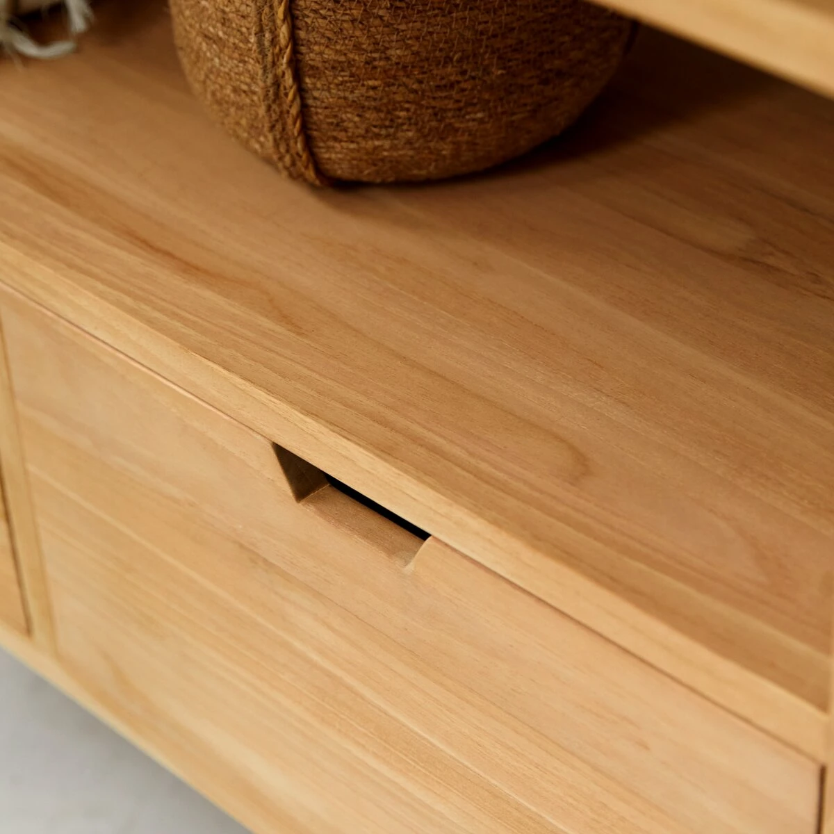 Le meuble sous vasque Kwarto 110 est fabriqué en teck brut massif provenant d’Indonésie. Parfait meuble de rangement, il est équipé d’une large niche ouverte et de 2 tiroirs, idéal pour votre salle de bain. Vous serez séduits par son style actuel et ses lignes classiques tout en élégance. Son charme réside également dans sa teinte beige naturelle. Côté pratique, notre meuble offre également un grand espace inférieur ouvert pour y glisser paniers et boîtes de rangement.
