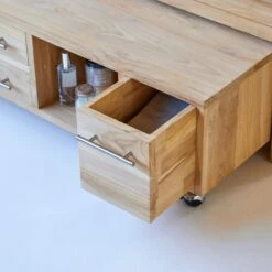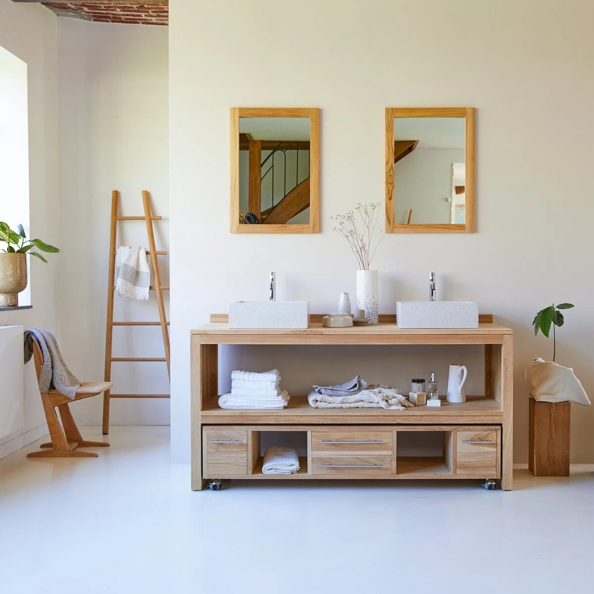 Large meuble de salle de bain en teck massif brut de haute qualitĂ©. Conçu pour 2 vasques. ce meuble sous vasque en teck sera du plus bel effet grâce Ă ses lignes parfaites ! Le meuble de salle de bain en teck Layang Duo est muni d’une niche ouverte et d’un module amovible composĂ© de 4 tiroirs posĂ© sur roulettes. Le meuble sous vasque en teck Layang duo, signĂ© Tikamoon, deviendra incontournable pour votre salle de bain.