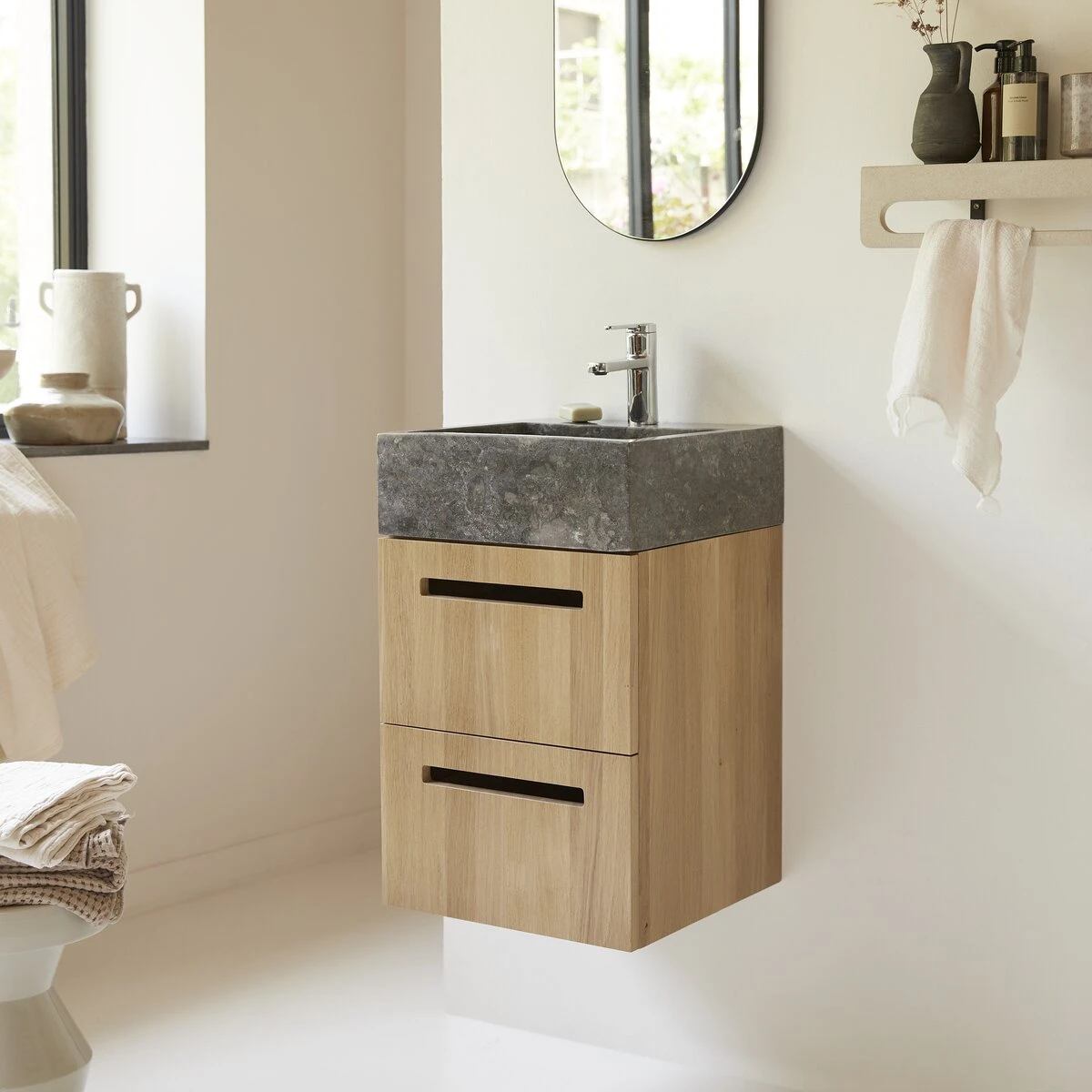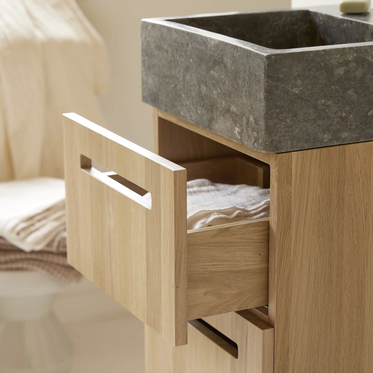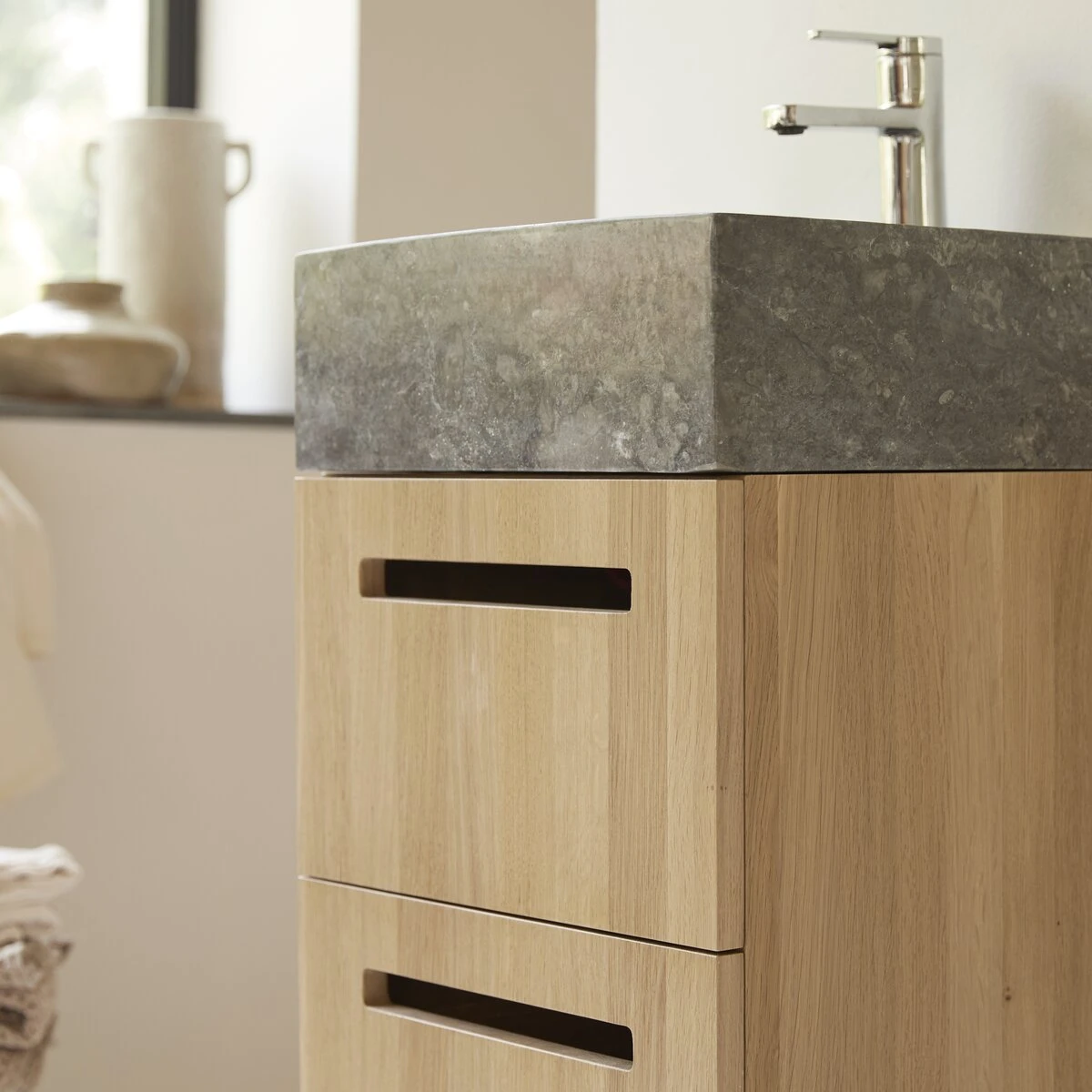 Alliance de deux matĂ©riaux nobles et durables, puretĂ© de ligne, praticitĂ© dâun modĂšle suspendu⊠le meuble de salle de bain Line en chĂȘne et marbre, trouve sa place dans les petites salles de bain pour en rĂ©veiller la dĂ©co ou compose un cabinet de toilette dans la chambre. TravaillĂ© dans un chĂȘne massif certifiĂ© FSCÂź, lâassurance quâil contribue Ă la gestion responsable des forĂȘts, ce meuble a tout dâun grand : une belle capacitĂ© de rangement assurĂ©e par 2 tiroirs spacieux et dont lâĂ©lĂ©gante ouverture Ă encoche est ergonomique !