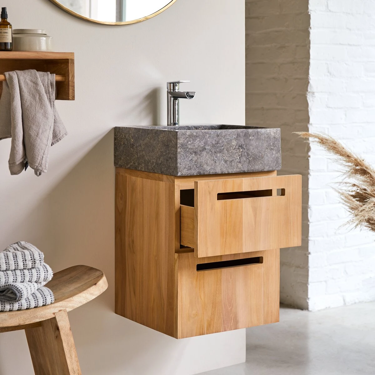 Vous aimerez son design scandinave, les ouvertures ergonomiques des deux larges tiroirs et la facilité d’entretien de la vasque. Vous apprécierez aussi la blondeur du teck naturel.