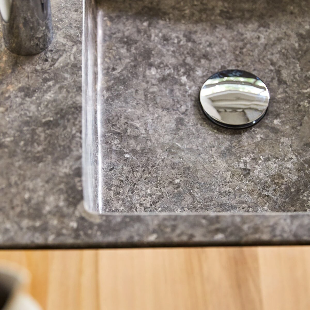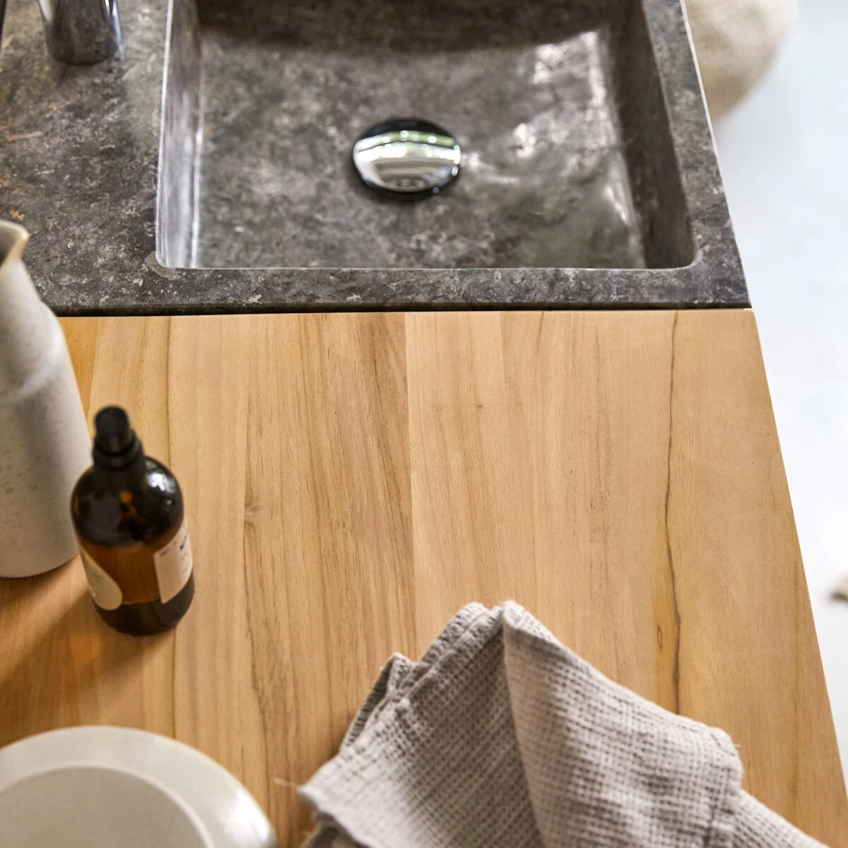 Le meuble de salle de bain en teck massif et vasque en marbre Line affiche une élégance naturelle très appréciée et un design scandinave propice à la relaxation…