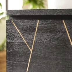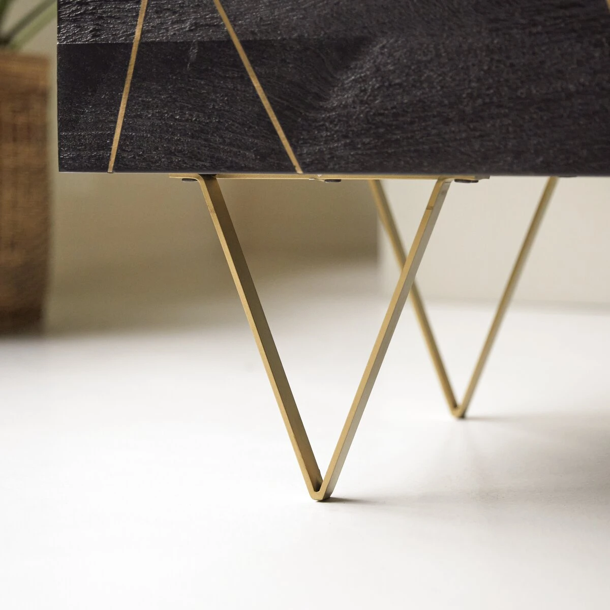 Parce-que détente rime avec style nous vous proposons une gamme originale à la fois pratique et esthétique. Vous aimerez le contraste du bois massif de manguier coloré allié au dessin Art deco des façades ornées de métal couleur laiton. Ses pieds épingles en métal doré lui confère chic et élégance !