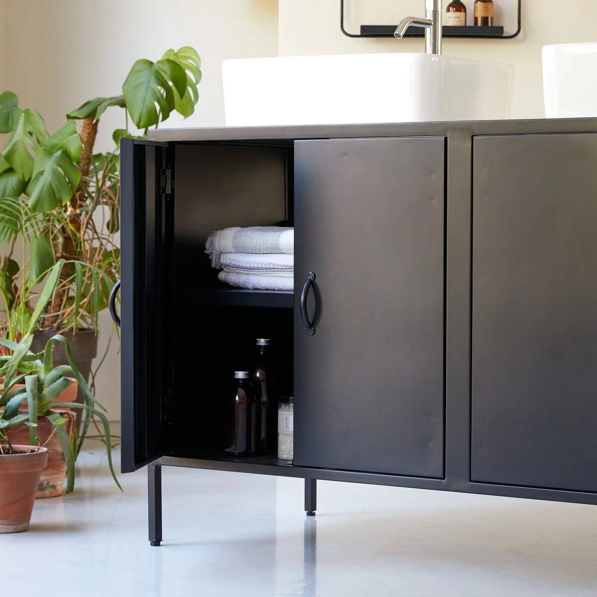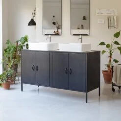 Conçu pour recevoir deux vasques à poser (retrouvez toutes nos vasques à poser), il offre un généreux espace de rangement. N’hésitez pas à lui associer d’autres meubles de notre collection bain Industriel pour un total look factory !
