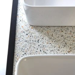 Avec le meuble de salle de bain en métal et terrazzo Lizzie, le style industriel s’enrichit d’une sophistication nouvelle : le plateau moucheté est travaillé dans un matériau très visuel, noble, et robuste.