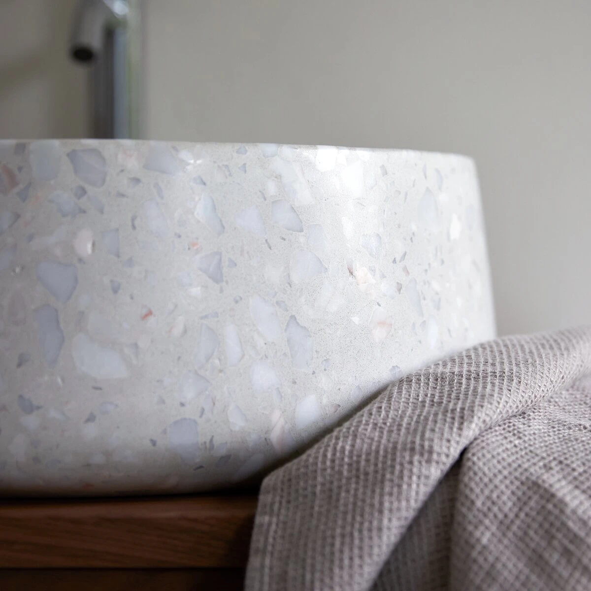 La vasque en terrazzo premium Milos, toute en rondeur et en douceur, offre le charme de la pierre naturelle et la facilité d’entretien d’un alliage bien pensé.