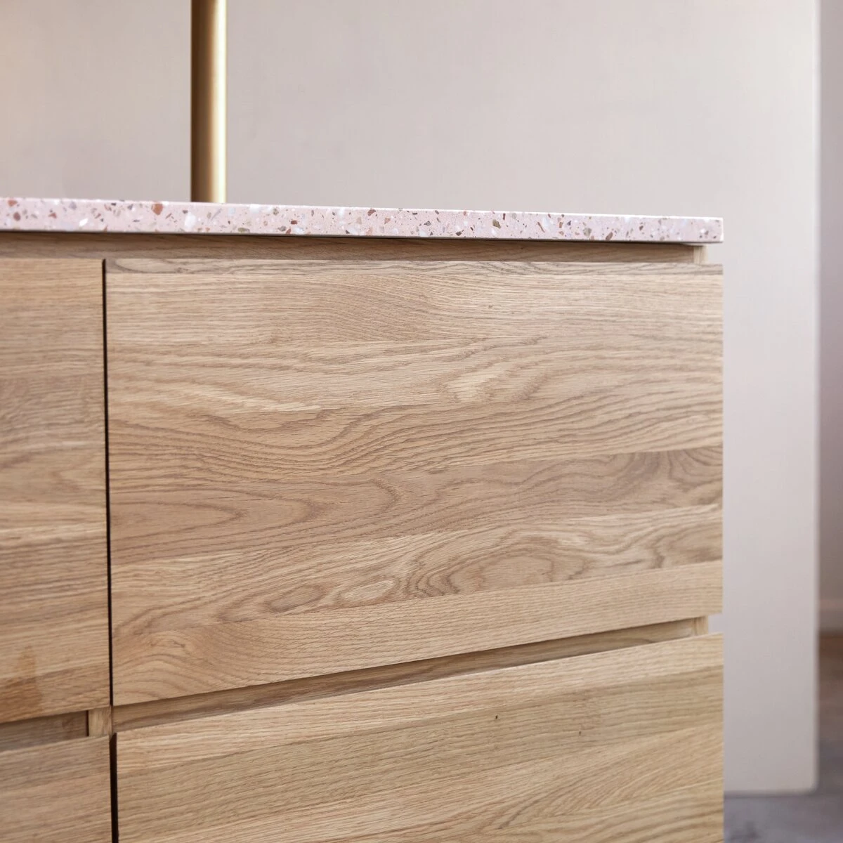 Le meuble de salle de bain Nova en chĂȘne massif et terrazzo premium pink existe aussi en 80 cm. Il est Ă©galement proposĂ© dans une version Ă©quipĂ©e dâun plan vasque en pierre de lave et une autre Ă©quipĂ©e dâun plan vasque cĂ©ramique. Il appartient Ă la collection Nova , une sĂ©rie de meubles spĂ©cifiquement pensĂ©s pour la salle de bain. Â