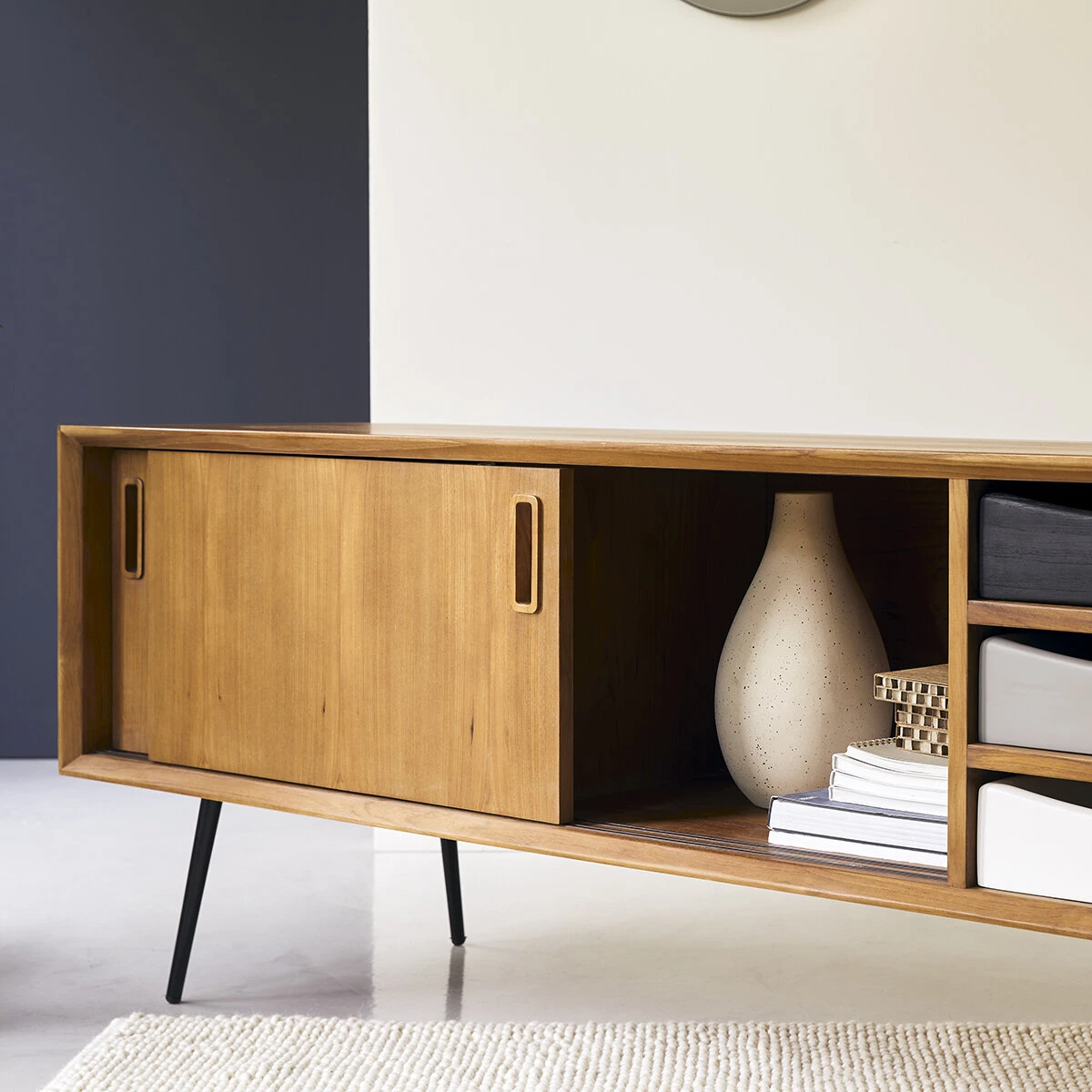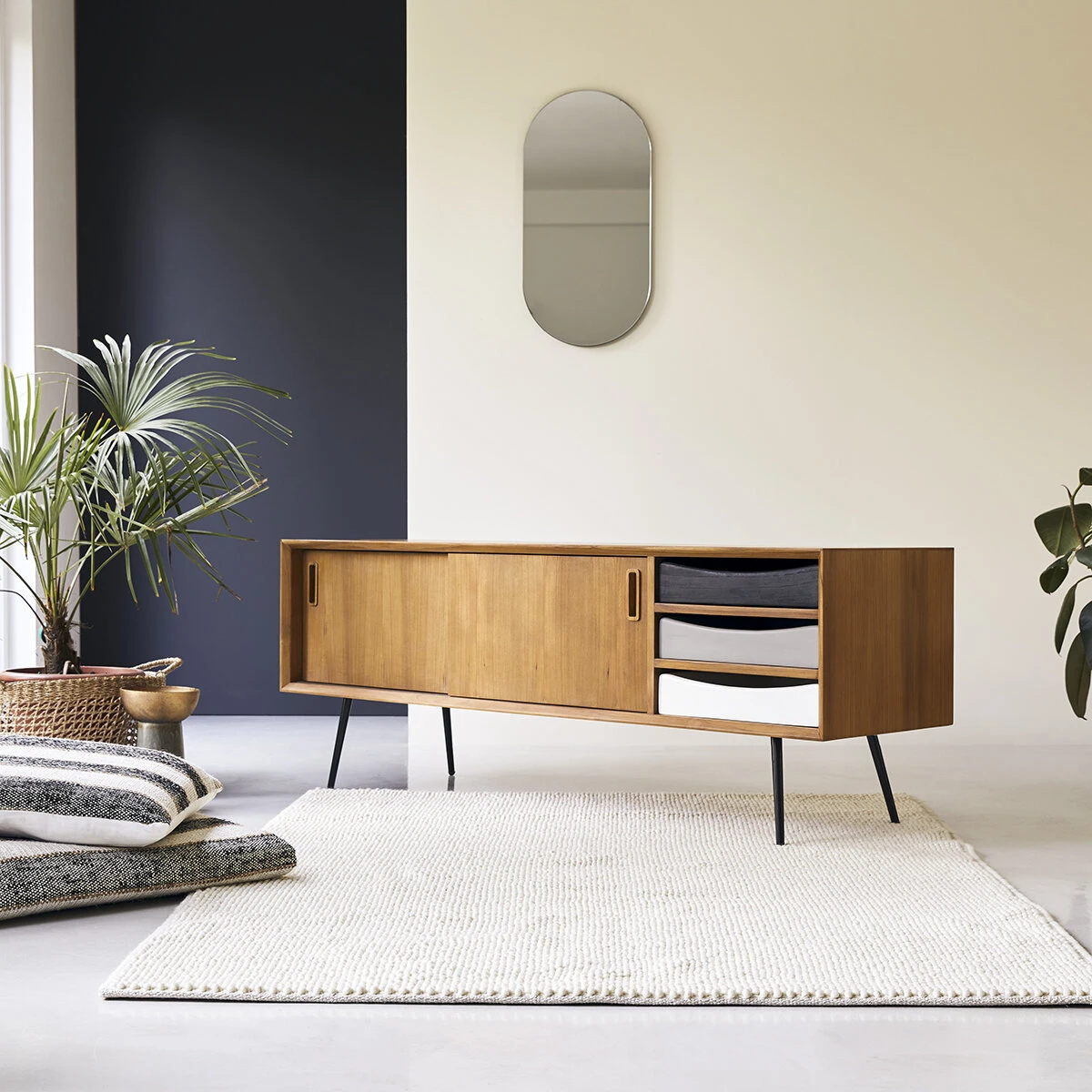 Notre meuble Tv Ruben est fabriquĂ© en teck provenant d’IndonĂ©sie. VĂ©ritable meuble de rangement, il est Ă©quipĂ© de 2 portes coulissantes ouvrant sur 2 niches, ainsi que de 3 tiroirs colorĂ©s interchangeables. Â