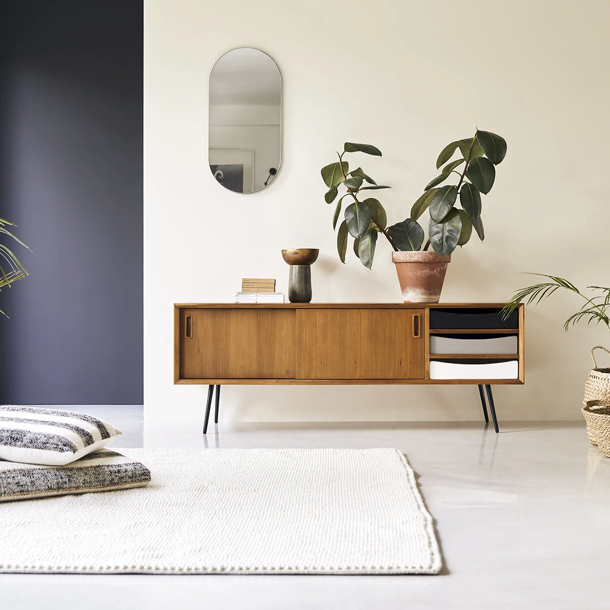 Vous serez séduits par son style simple et sophistiqué. Son design scandinave est caractérisé par ses pieds en métal obliques ainsi que ses lignes géométriques. Son originalité réside dans l’alliance de la teinte du bois ainsi que ses tiroirs colorés qui apportent un contraste élégant entre authenticité et douceur.