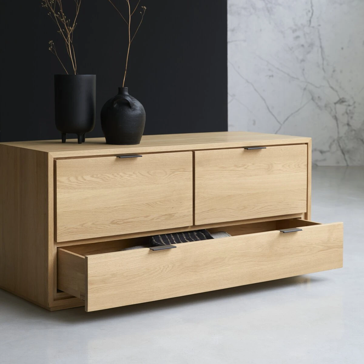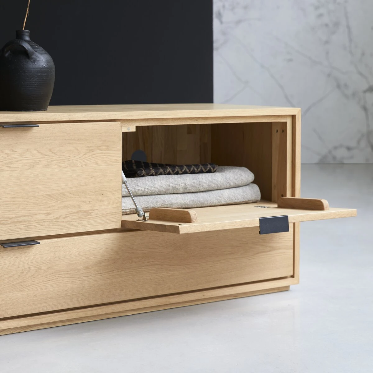On aime la qualitĂ© premium de son chĂȘne massif certifiĂ© FSCÂź, la finition huilĂ©e et le cadre fin qui allĂšge visuellement le design. Pratique pour tout organiser dans le salon, il est Ă la fois bien pensĂ© et esthĂ©tique.