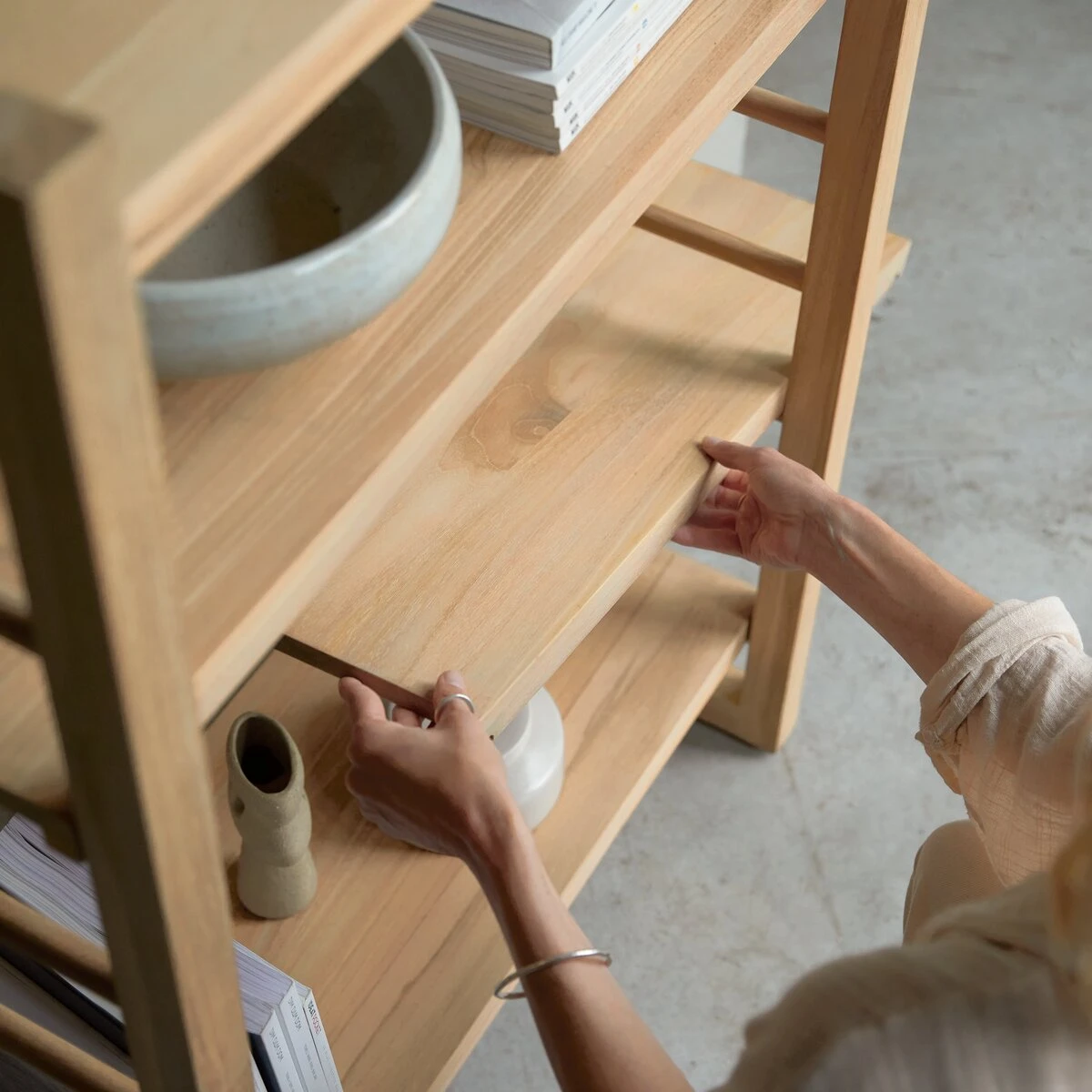 La bibliothèque en teck massif Sera (80 x 115 cm) requiert un minimum d’encombrement pour un maximum de rangement. 4 étagères reçoivent livres, déco, plantes et autres objets du quotidien. Parfaite au salon, elle trouve aussi tout naturellement sa place, version étagère, dans la chambre, le bureau ou la salle de bain.