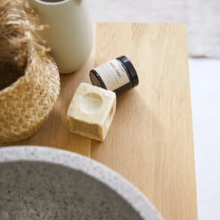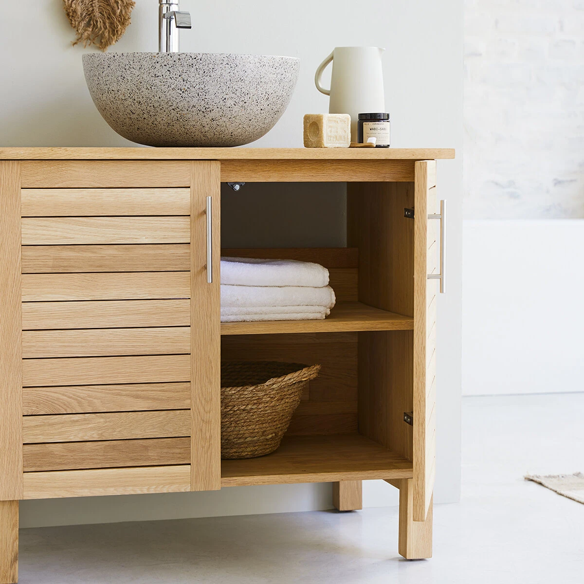 Conçu pour recevoir une vasque en marbre ou en terrazzo, le meuble de salle de bain en chĂȘne Soho existe aussi en version 125 cm et 165 cm, parfaites pour deux vasques Ă poser.Â
