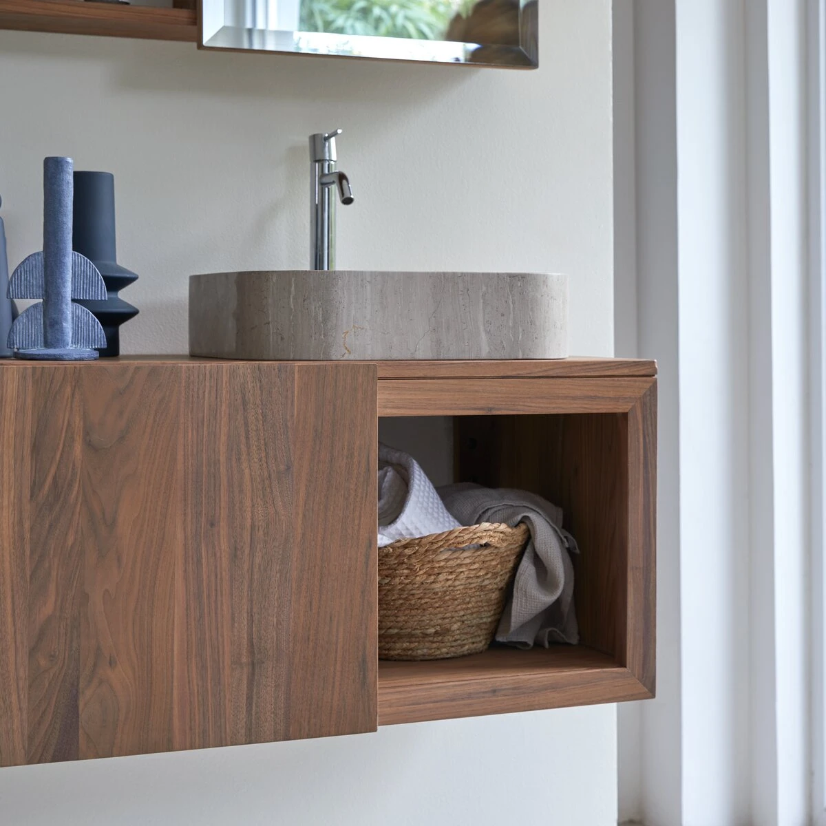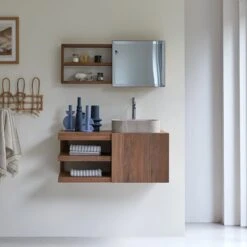 Contemporain et plein de personnalitĂ©, le meuble sous vasque en noyer massif certifiĂ© FSC® Typo conjugue avec talent minimalisme et matĂ©riau de qualitĂ©. TravaillĂ© dans un bois noble aux veines apparentes du plus bel effet, il affiche de nombreux atouts de sĂ©duction : suspendu, il ne prend pas de place au sol, affiche des lignes Ă©purĂ©es et une conception bien pensĂ©e – un cĂ´tĂ© est prĂ©vu pour la vasque Ă poser (retrouvez tous nos modèles de vasques Ă poser), l’autre pour les objets qu’on veut garder Ă portĂ©e de main. Une niche fermĂ©e par une porte coulissante permet de masquer ce qui doit l’être et les deux niches ouvertes, d’exposer ce qu’on aime comme les jolies serviettes ou des accessoires.
